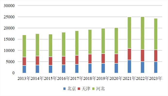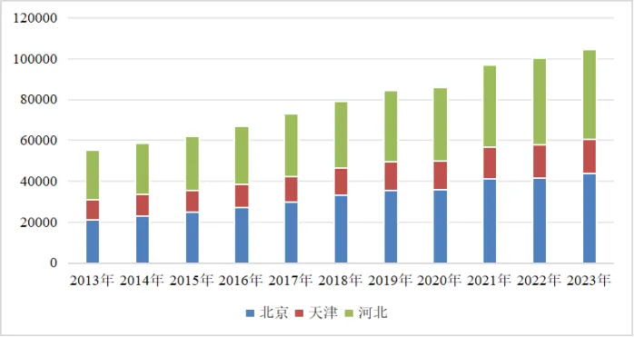 圖1 京津冀2013-2023年地區生產總值(億元)1