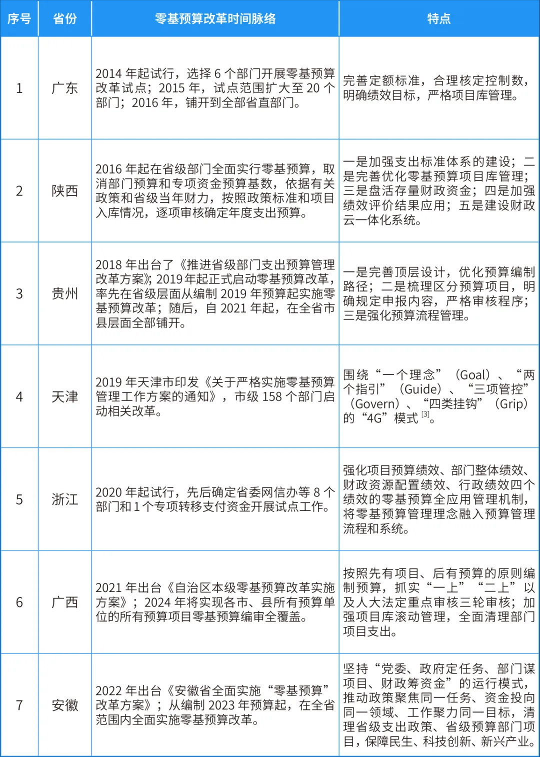 隨著我國財政體制改革的不斷推進,2014年《中華人民共和國預(yù)算法》頒布,為加快建立和完善現(xiàn)代財政制度提供了強有力支持,零基預(yù)算理念再次受到重視。廣東、陜西、上海等地以“統(tǒng)籌兼顧、勤儉節(jié)約、量力而行、講求績效和收支平衡”的原則為基本遵循,開展了新一輪零基預(yù)算探索,將改革重心聚焦于部門公用經(jīng)費標準的合理確定以及項目庫的建設(shè)與完善等方面。2021年3月,《國務(wù)院關(guān)于進一步深化預(yù)算管理制度改革的意見》明確“積極運用零基預(yù)算理念,打破支出固化僵化格局,合理確定支出預(yù)算規(guī)模”的要求,再次強調(diào)未來預(yù)算管理制度改革中零基預(yù)算的重要性。各地通過在預(yù)算編制環(huán)節(jié)減少支出、優(yōu)化支出結(jié)構(gòu),為國家重大戰(zhàn)略任務(wù)和基本民生提供財力保障。2024年7月,黨的二十屆三中全會進一步提出“健全預(yù)算制度,加強財政資源和預(yù)算統(tǒng)籌,深化零基預(yù)算改革”。隨后,財政部選定了中國氣象局等16個部門作為試點,研究探索以零基預(yù)算理念為引導(dǎo)、提升部門預(yù)算科學(xué)管理水平的改革,為推進零基預(yù)算改革的深化開啟頂層路線設(shè)計的探索。