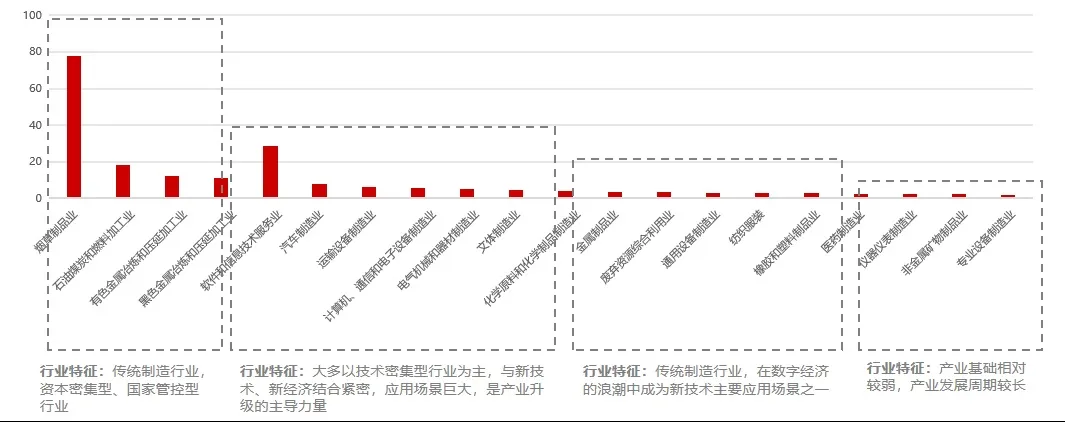 第三類是3<固定資產投資效率<5,主要特征是傳統制造行業,在數字經濟的浪潮中成為新技術主要應用場景之一。主要行業包括化學原料和化學制品制造業、金屬制品業、通用設備制造業、紡織服裝業等。