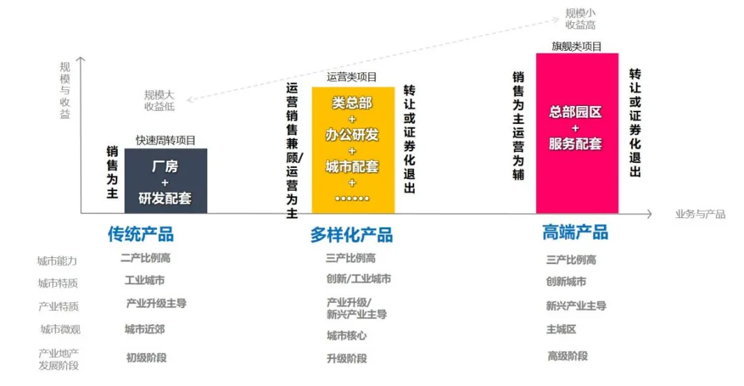 產業地產的產品定位要結合城市進入策略、產業定位策略進行系統性分析,可以根據不同的城市特征、城市性質、產業性質、城市微觀和發展階段,形成三大類產品:第一類是傳統產品,包括工業廠房+研發配套等業態,實施快速周轉的運營策略;第二類是多樣化的產品,主要包括類總部、研發辦公、配套服務等業態,實施運營銷售兼顧的策略,最終通過整體出售、轉讓或出租運營REITs實現項目退出;第三類是旗艦類產品,主打核心地段高端產品,主要包括總部經濟、研發辦公、配套服務等業態,實施銷售為主運營為輔的策略,最終通過整體銷售等形式實現項目退出。