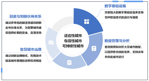 國際上,智慧城市建設(shè)主要關(guān)注包容性、可持續(xù)性與適應(yīng)性三個方面,強(qiáng)調(diào)智慧城市建設(shè)對于提高社會包容性、促進(jìn)城市可持續(xù)發(fā)展以及提高城市韌性、快速應(yīng)對挑戰(zhàn)的重要性。影響智慧城市建設(shè)的關(guān)鍵驅(qū)動因素包括數(shù)字基礎(chǔ)設(shè)施、數(shù)據(jù)管理與分析、融資與創(chuàng)新伙伴關(guān)系及智慧城市治理。