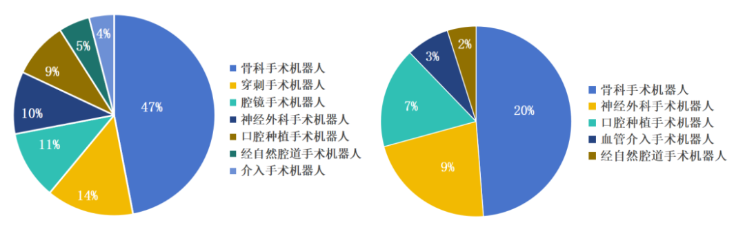 從獲批數量看,骨科手術機器人獲批50余款,占比近50%,遠超其他類型機器人,腔鏡、神經外科、穿刺機器人均獲批10款左右。從市場份額看,腔鏡手術機器人以其更高的產品價格和臨床應用科室位列第一,占比近60%,其次是骨科手術機器人,占比20%。
